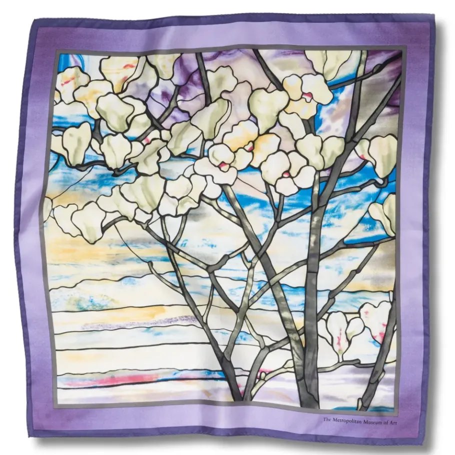 Featuring Lush, Radiant Colors, The Museum’S Magnolias And Irises Neckerchief Is Based On An Original Louis Comfort Tiffany (American, 1848–1933) Favrile Glass Window Depicting A Picturesque Landscape. The Window Features An Embankment Of Irises Idly Situated Beneath Flowering Magnolia Trees In The Foreground. Magnificent Purple Hills Are Set In The Background With A Central Meandering Stream, Possibly Emblematic Of The River Of Life. This Piece Exemplifies Louis Comfort Tiffany’S Lifelong Fascination With Light, Color, And Nature.