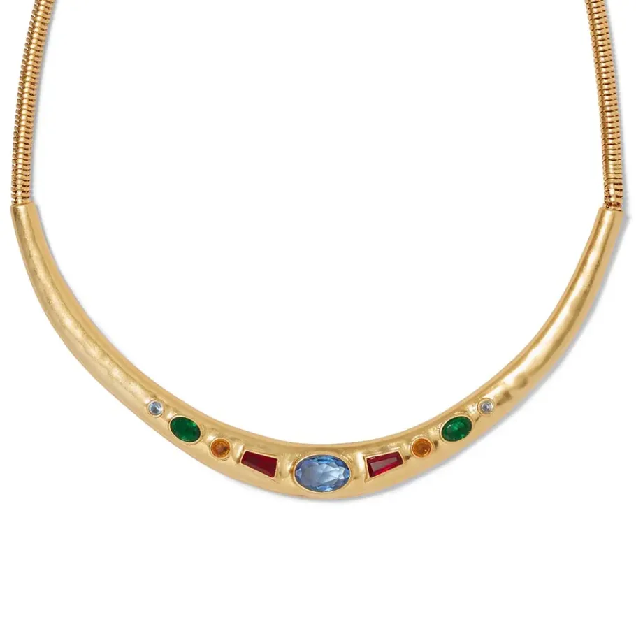 The Embedded Glass Stones Defining This Collar Necklace Reinterpret The Red Garnets And Blue Glass Embellishments On A Striking 7Th-Century Frankish Disk Brooch At The Met. Brooches Were Central To The Evolution Of Frankish Fashion; Between The 300S And 500S, Women Turned To Pairs Of Small Brooches In Inventive Shapes To Fasten The Wraps They Wore Around Their Tunics. By The 600S, Single, Large, And Elaborately Decorated Disk Brooches Became Popular Functional Adornments. The Brooch Is Regarded As The Most Characteristic Element Of Frankish Dress, And Exemplifies The Exceptional Skill Of Frankish Metalworkers.