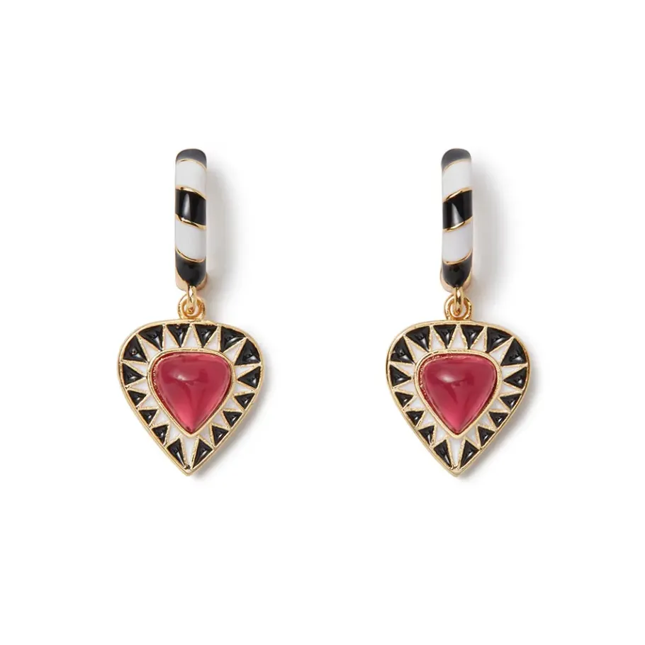 These Head-Turning Huggie Earrings Reinterpret A Pair Of Remarkable Gold, Stone, And Glass Earrings (3Rd–2Nd Century B.C.) From Hellenistic Greece In The Museum’S Holdings. Egyptian Influences Became Fashionable In Greek Jewelry During Egypt’S Ptolemaic Reign (323–31 B.C.), As Exemplified In Some Of The Detailing On These Spectacular Adornments In The Met Collection. Among Their Many Components Is An Egyptianized Atef Crown—A Tall Headdress Typically Worn By The God Osiris—Made Of A Sun Disk In A Translucent Stone Surmounted By Twin Feathers Of Opaque Black-And-White Glass; And A Heart-Shaped Pendant With A Red Stone, Bordered By A Black-And-White Sawtooth Design.