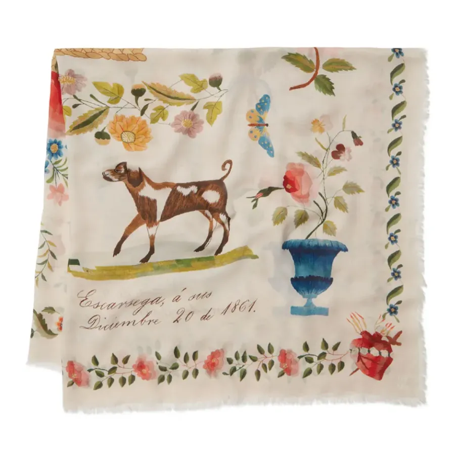 Popular Between The 17Th And Early 20Th Centuries, Embroidered Cloths Known As Samplers Often Exhibit Decorative Patterns, Symbols, Alphabets, And Verses That Showcase The Needlework Proficiency Of The Young Women Who Typically Crafted Them—As A Pastime And As Training For Their Awaited Domestic Roles. Our Charming Scarf Reproduces The Secular And Religious Images On A Linen Sampler From Mexico In The Met Collection. The Original Features Radiant Floral Motifs And Bursting Bouquets; Dogs, Birds, And Butterflies; And A Trio Of Sacred Hearts—Indicating The Artisan’S Catholic Heritage—Beneath An Inscription To Their Beloved Parents, Dated December 20, 1861.