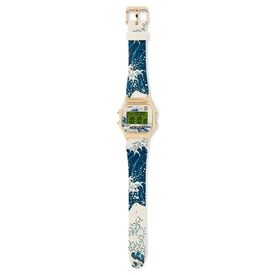 Katsushika Hokusai’S (Japanese, 1760–1849) Under The Wave Off Kanagawa, Also Known As The Great Wave (Ca. 1830–32), Features On Timex’S T80 Design. This World-Famous Woodblock Print From Hokusai’S Beloved Series Thirty-Six Views Of Mount Fuji Depicts A Colossal Wave Framing A Comparatively Small Mount Fuji In The Background; A Tribute To The Awesome Power Of Nature. Equipped With A Chronograph Function, Daily Alarm, Acrylic Crystal, Indiglo® Backlight, And Date Display, This Beautifully Detailed Watch Transforms A Met Masterpiece Into A Timeless Work Of Wearable Art.