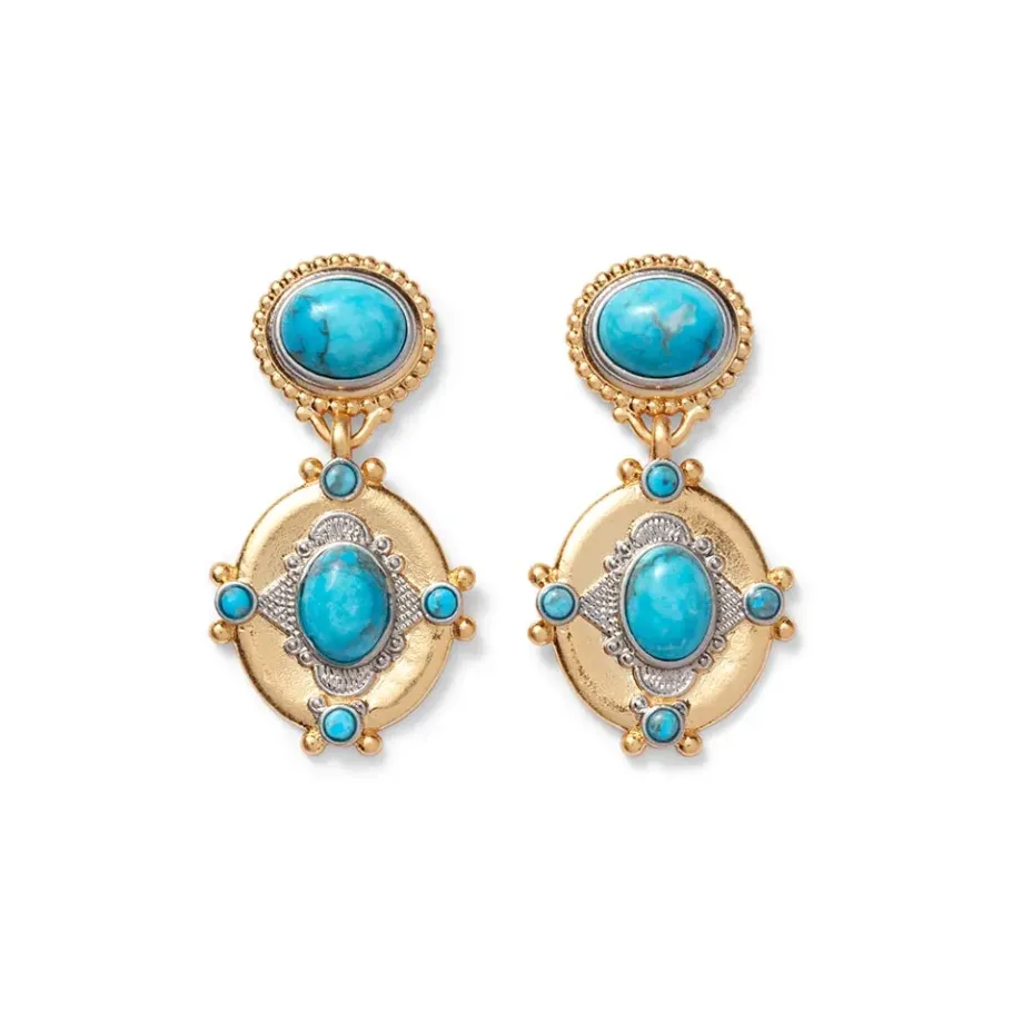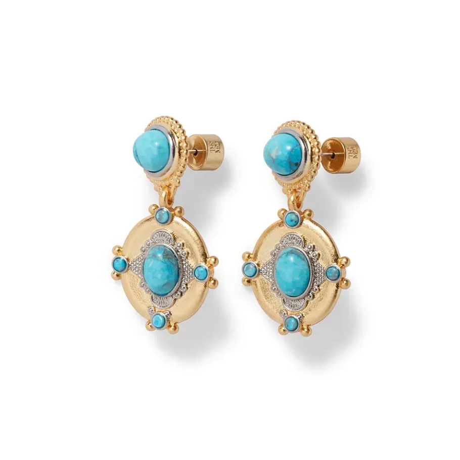 These Striking Turquoise Earrings Reinterpret A Lavish Horse Whip (Late 19Th–Early 20Th Century) In The Met’S Islamic Art Collection. Attributed To Iran Or Central Asia, The Original Whip Is One Of A Pair, Both Of Which Are Richly Decorated With Pseudo-Granulation And Turquoise In The Kazakh Style And Feature Likenesses Of Horse Heads—A Rare Attribute. Such Opulent Trappings Are Reminiscent Of The Regalia Produced During The Safavid And Ottoman Dynasties, Which Clearly Served As Models For These Pieces In The Museum’S Holdings. Islamic Trappings Are Particularly Fine, And Both Turkmen Tribes And City Dwellers Carried On The Tradition.