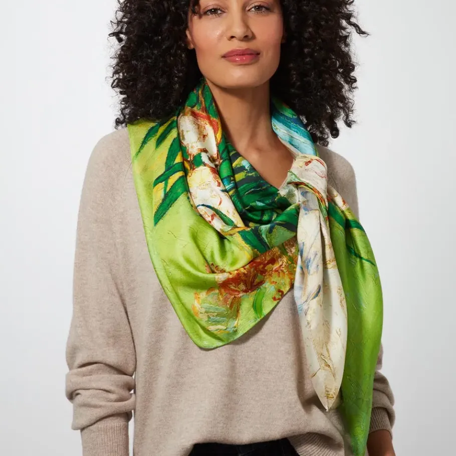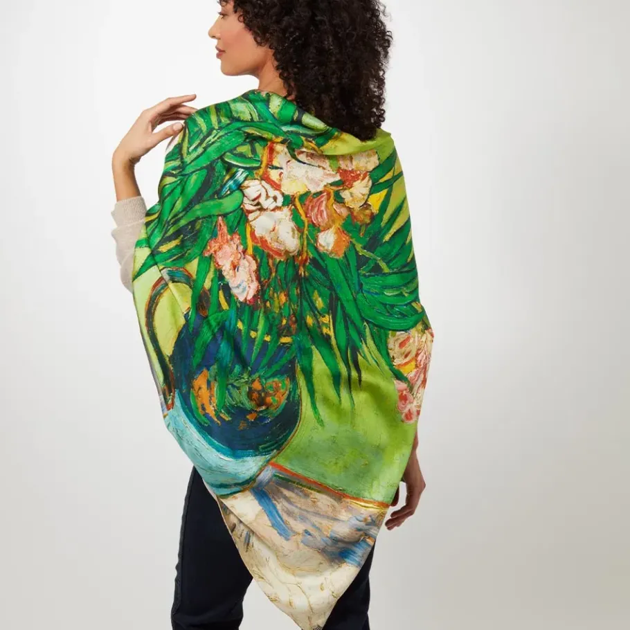 The Pink Petals Defining The Joyous Bouquet On Our Oversize Square Silk Scarf Are That Of Oleanders, Which Vincent Van Gogh (Dutch, 1853–1890) Regarded As Life-Affirming Flowers For The Way They Bloomed “Inexhaustibly.” In This Vibrant Still Life From August 1888, The Artist Immortalized An Arrangement Of Oleanders In A Majolica Jug, Which Also Appears In Other Still Lifes Made During His Time In Arles. Nearby, Van Gogh Has Symbolically Depicted A Copy Of Emile Zola’S Novel La Joie De Vivre.